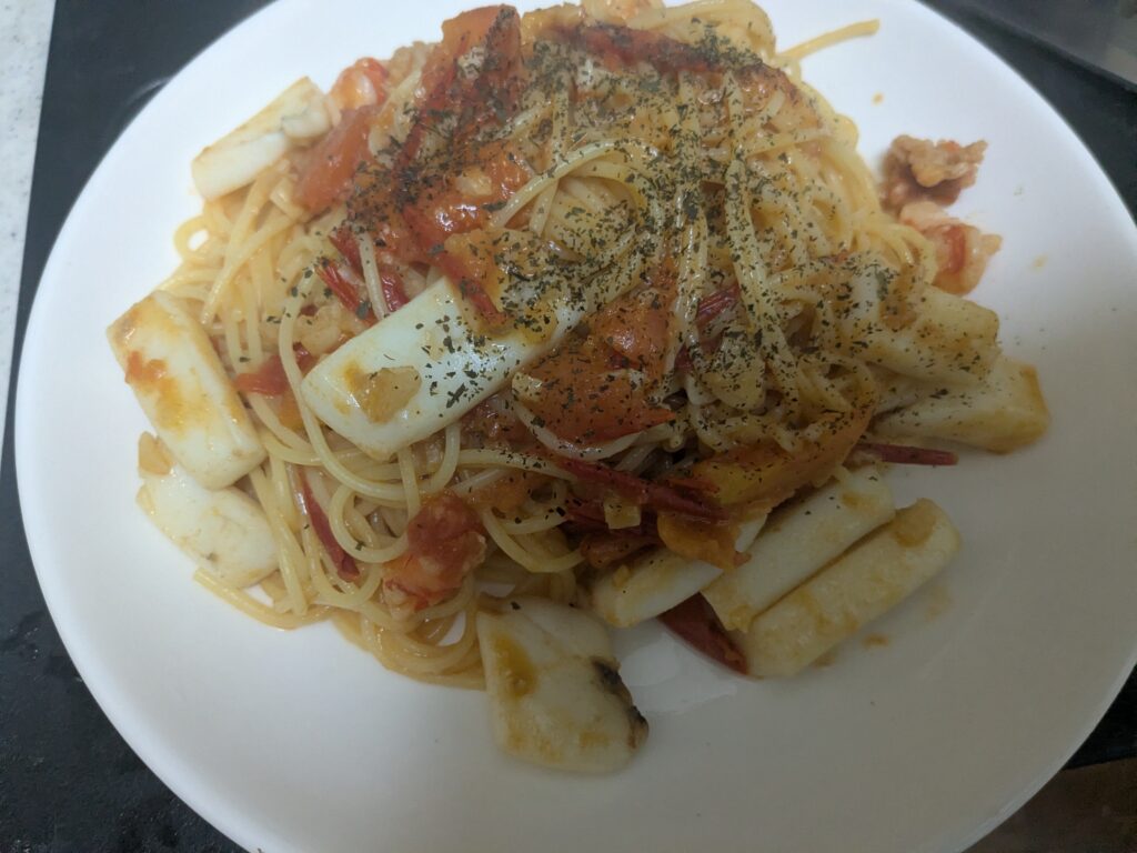そのダシをトマト・ニンニクを炒めたところに入れてパスタと和えると伊勢海老ダシのパスタの完成です。